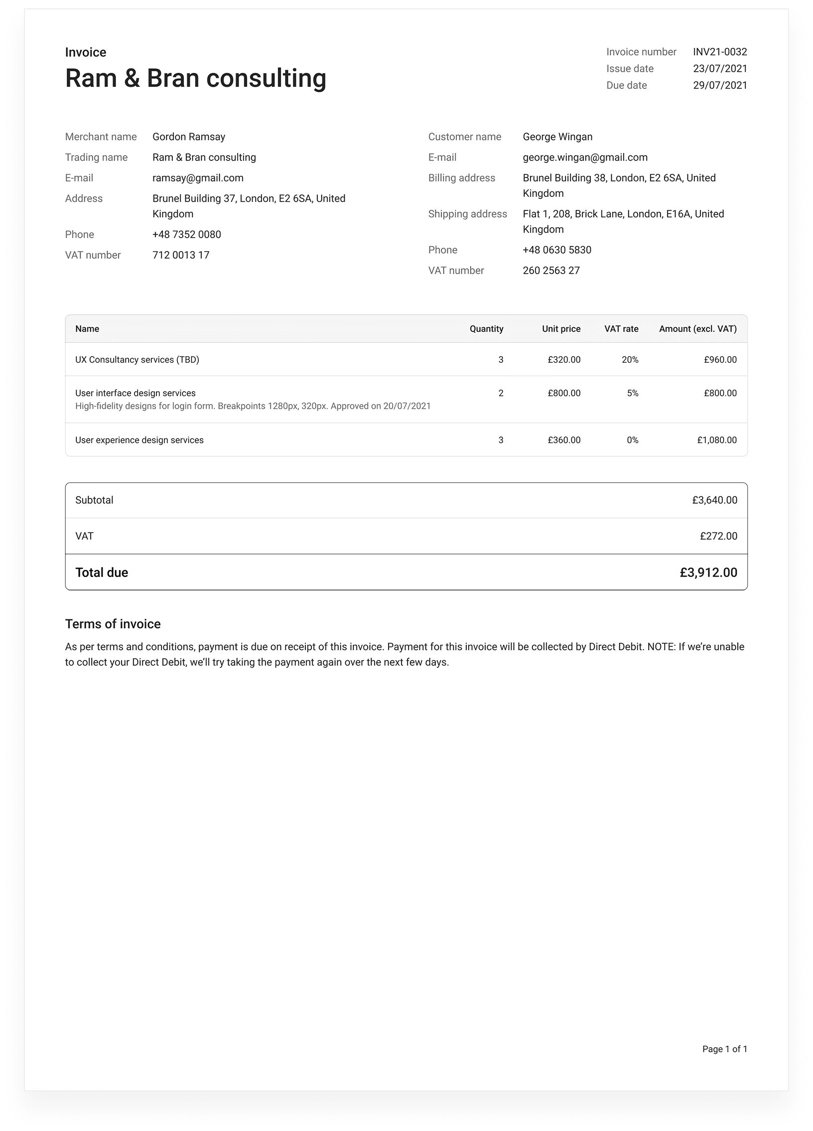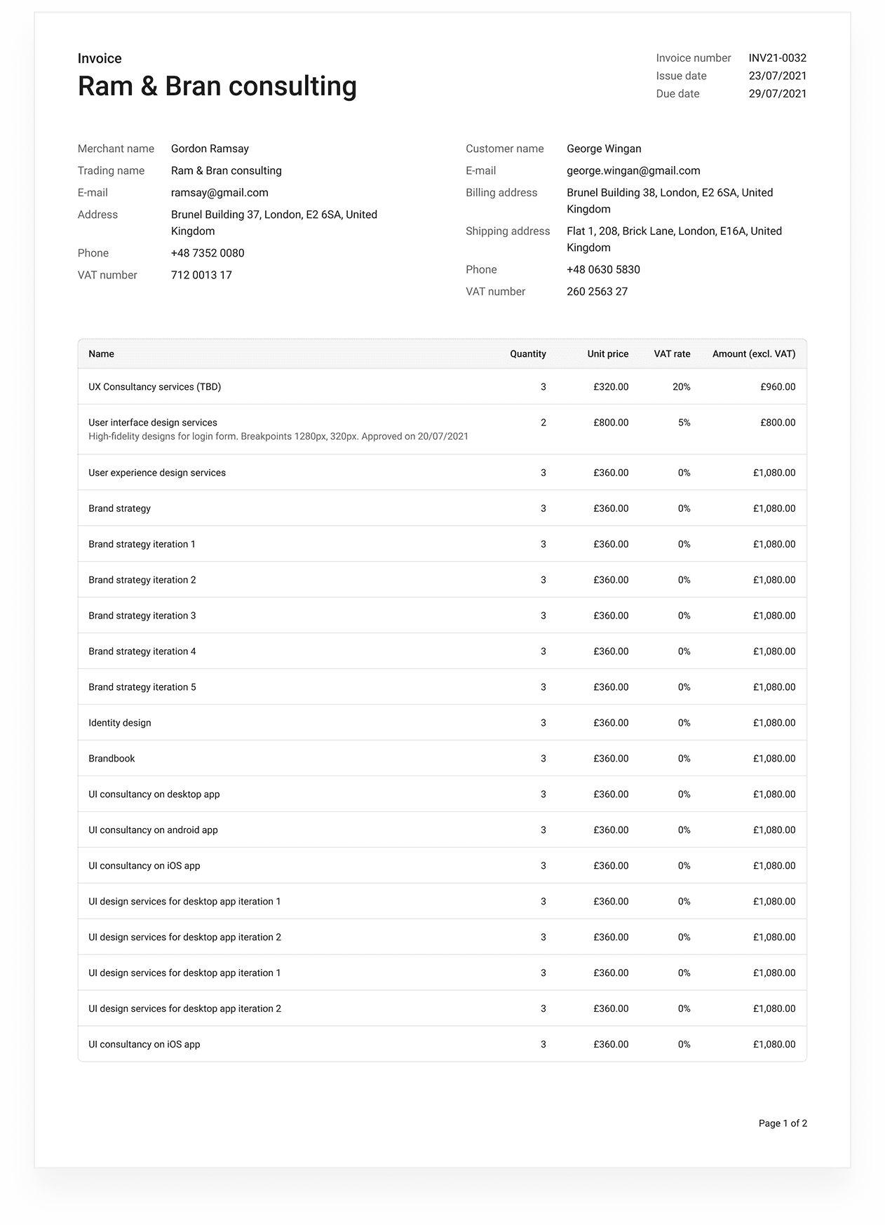 The invoice template was designed to accommodate various types of companies: solo trader, partnership, limited company, taking into account different quantities of items and, consequently, the length of the invoice.