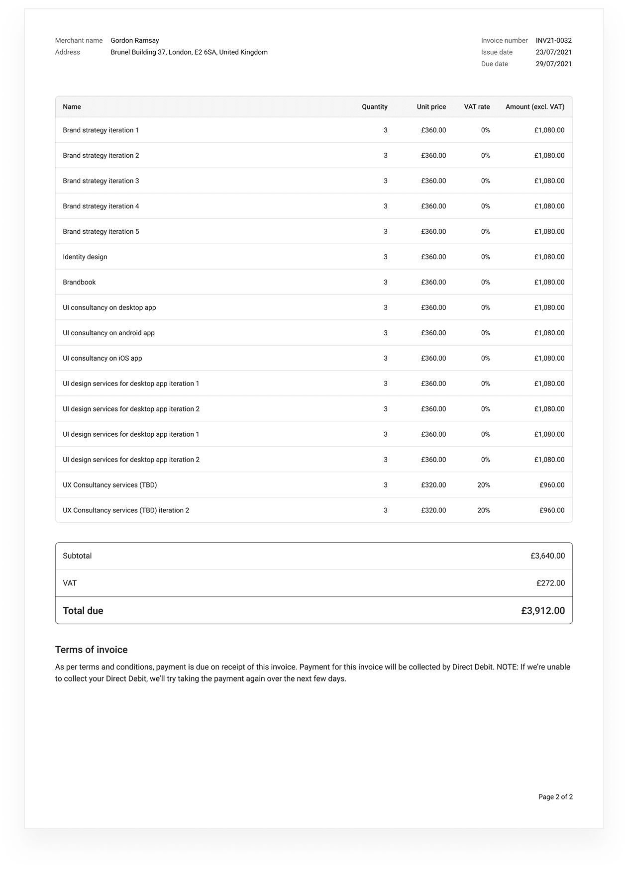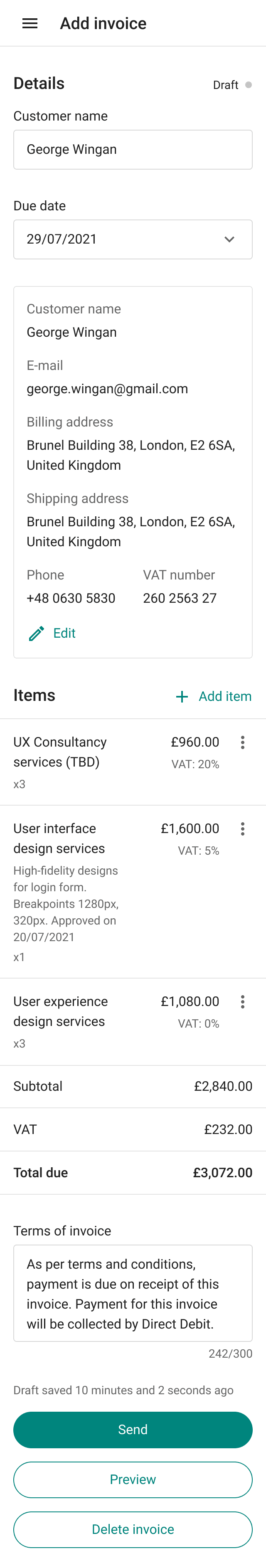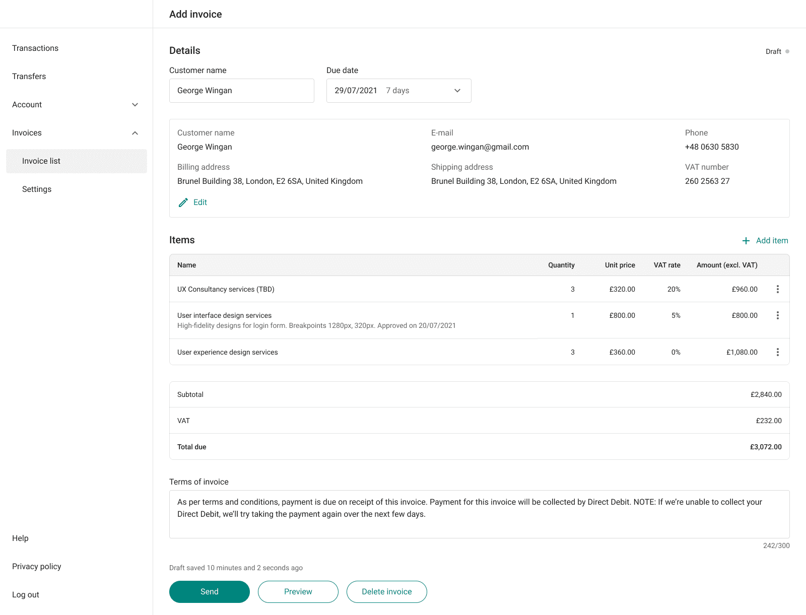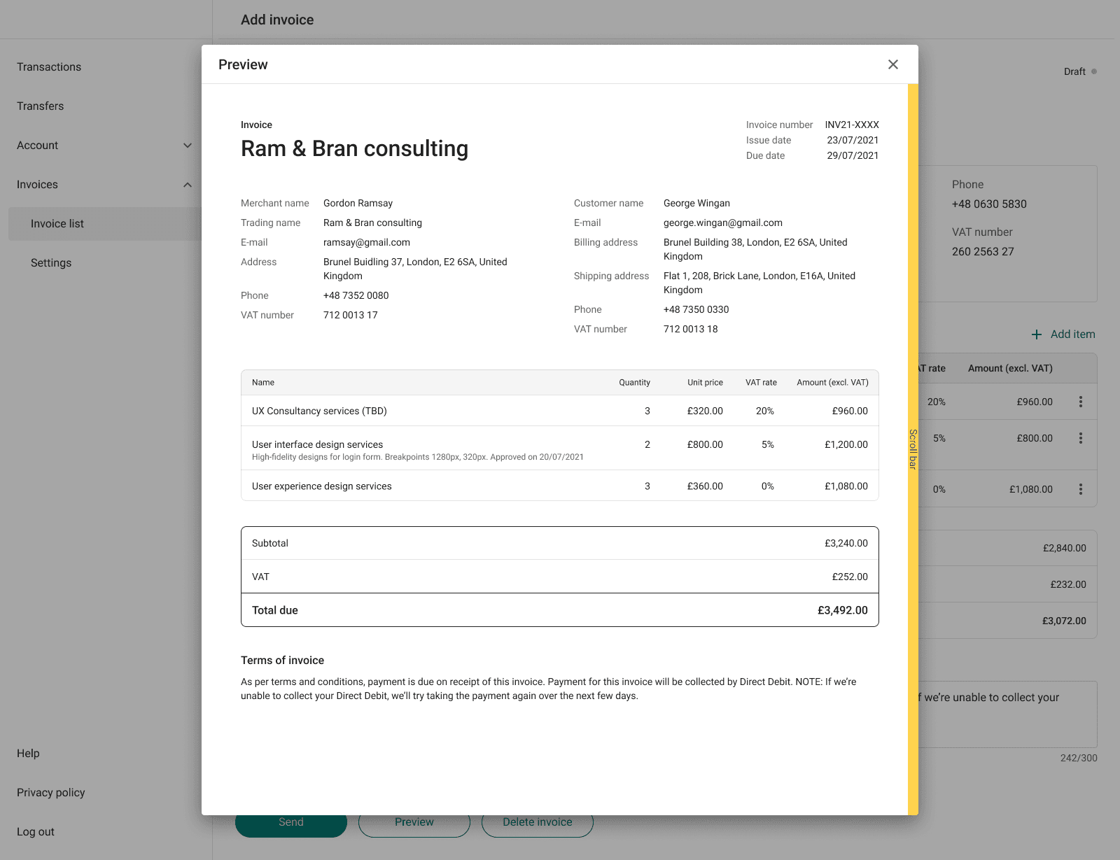 The goal of the project is to develop the invoicing service of a leading FinTech company, which helps over 70,000 small businesses in the UK and Ireland easily and securely accept payments. The service integrates with the main platform and is available on computers, tablets, and mobile devices.