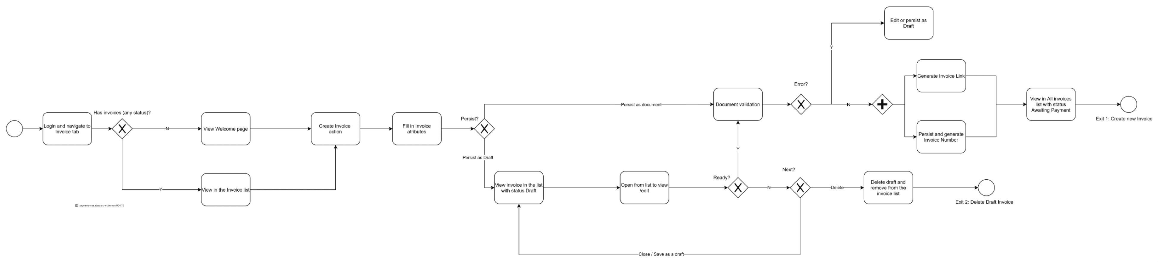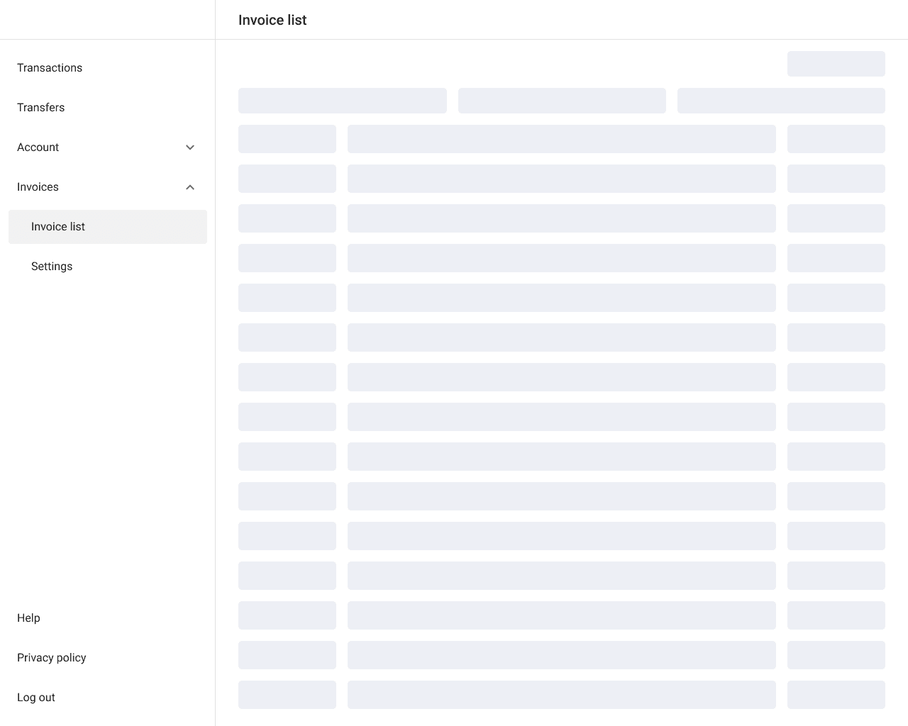 During the early wireframing stage, decisions were made about what to include on an empty page. The choice was between adding filters, table header, which would only appear when there are invoices present, or keeping it simple to highlight the primary action: 'Invoice creation'. We opted for simplicity to ensure the main action stands out.