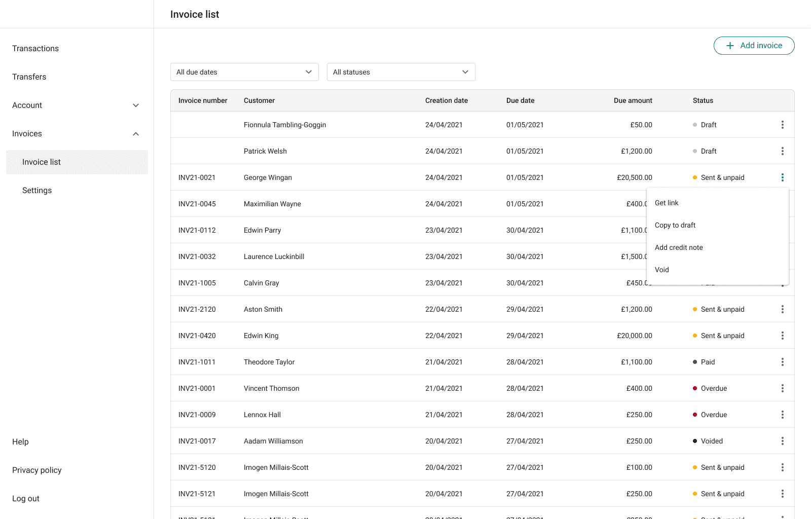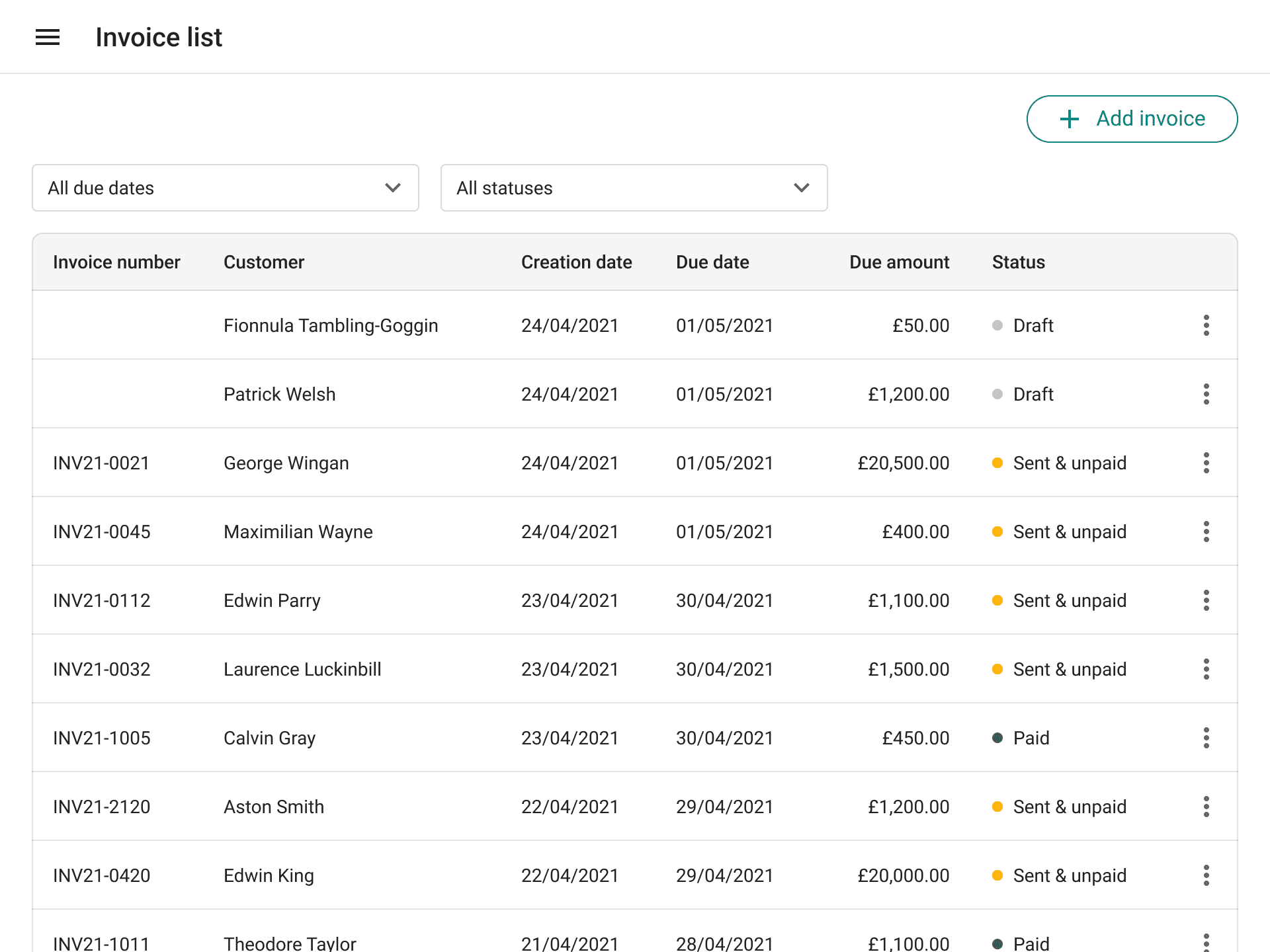 By default, Draft status invoices are displayed at the top of the list, reminding the user of unfinished invoices. Subsequently, invoices are sorted by date. The filters are designed in the style of the main application, allowing the user to filter by the 'due date' and 'status' parameters. The context menu per row enables performing identical actions on invoices as within the invoice page, thereby accelerating user actions.