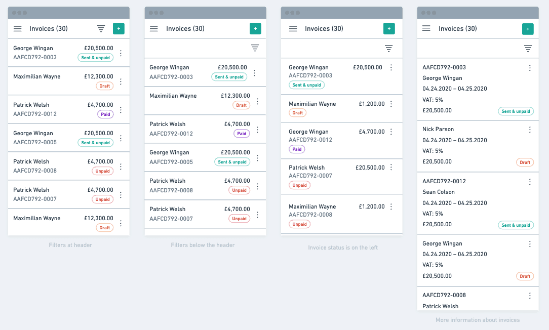 At the low-fi wireframes, the direction for the mobile version of the invoice list was also determined. Priority was given to a more compact version in terms of height. Both minimum and maximum values of each parameter were taken into account.