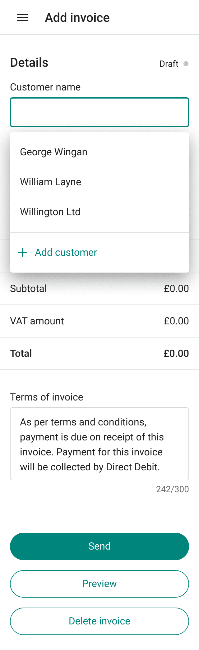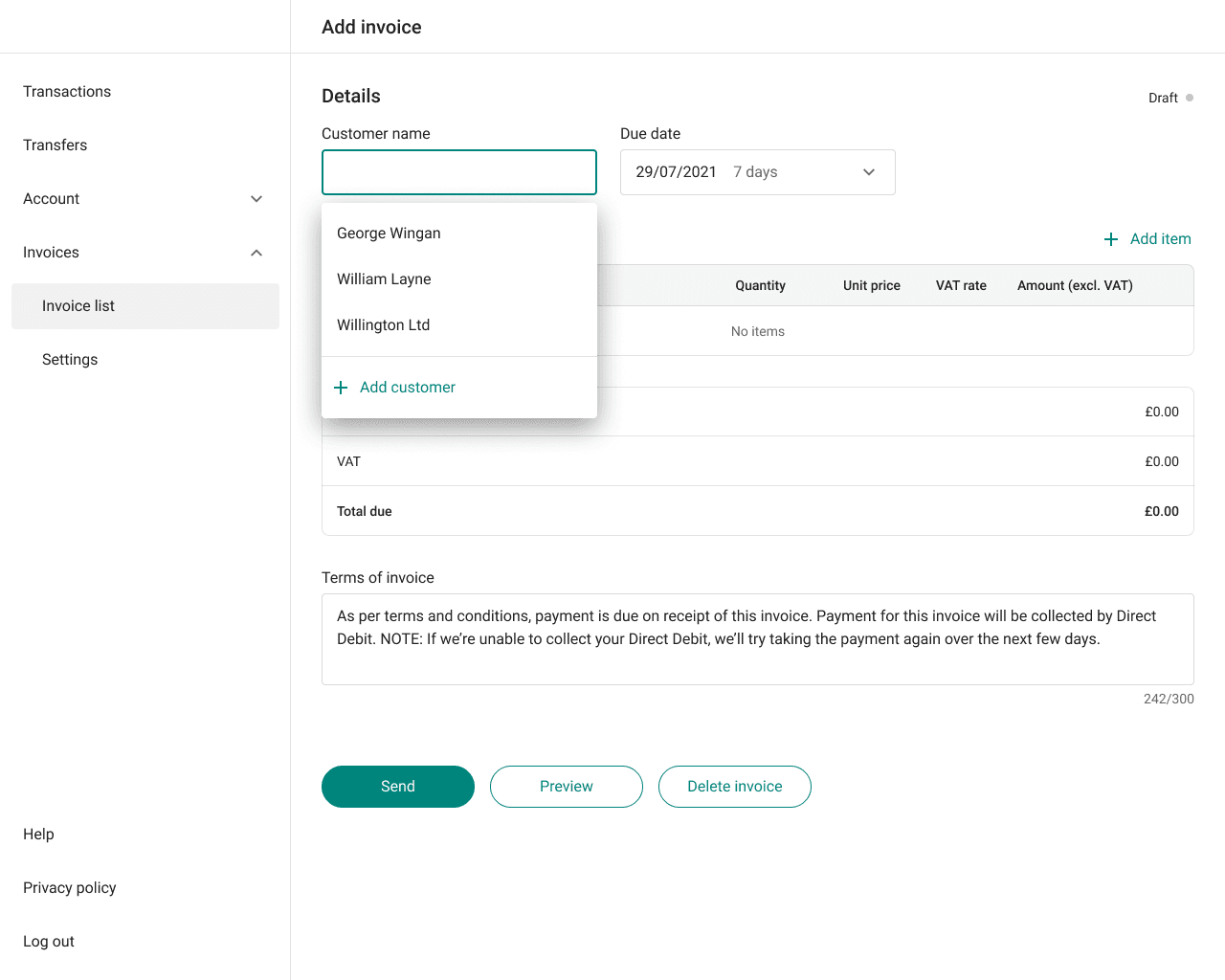 Used customer names are displayed in the dropdown menu of the Customer name field, with the Add customer option at the bottom of the list. It was crucial to show user data, so after selecting or creating a new customer, their details are displayed on the page. Users can choose default Due date or set a custom date. Following this, they can add items and specify the terms of the invoice.