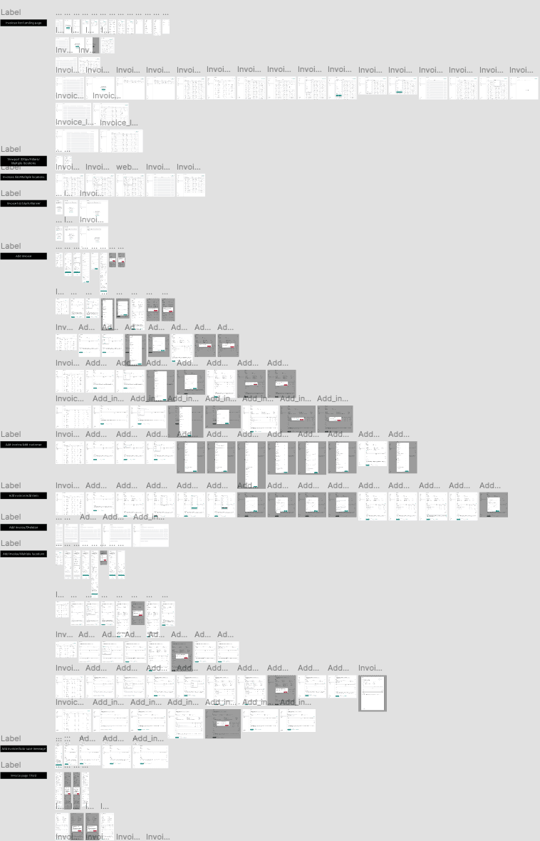 At the lo-fi level, wireframes were designed for creating a new invoice, displaying a list, editing an invoice, and the mobile view for both the list and invoice.