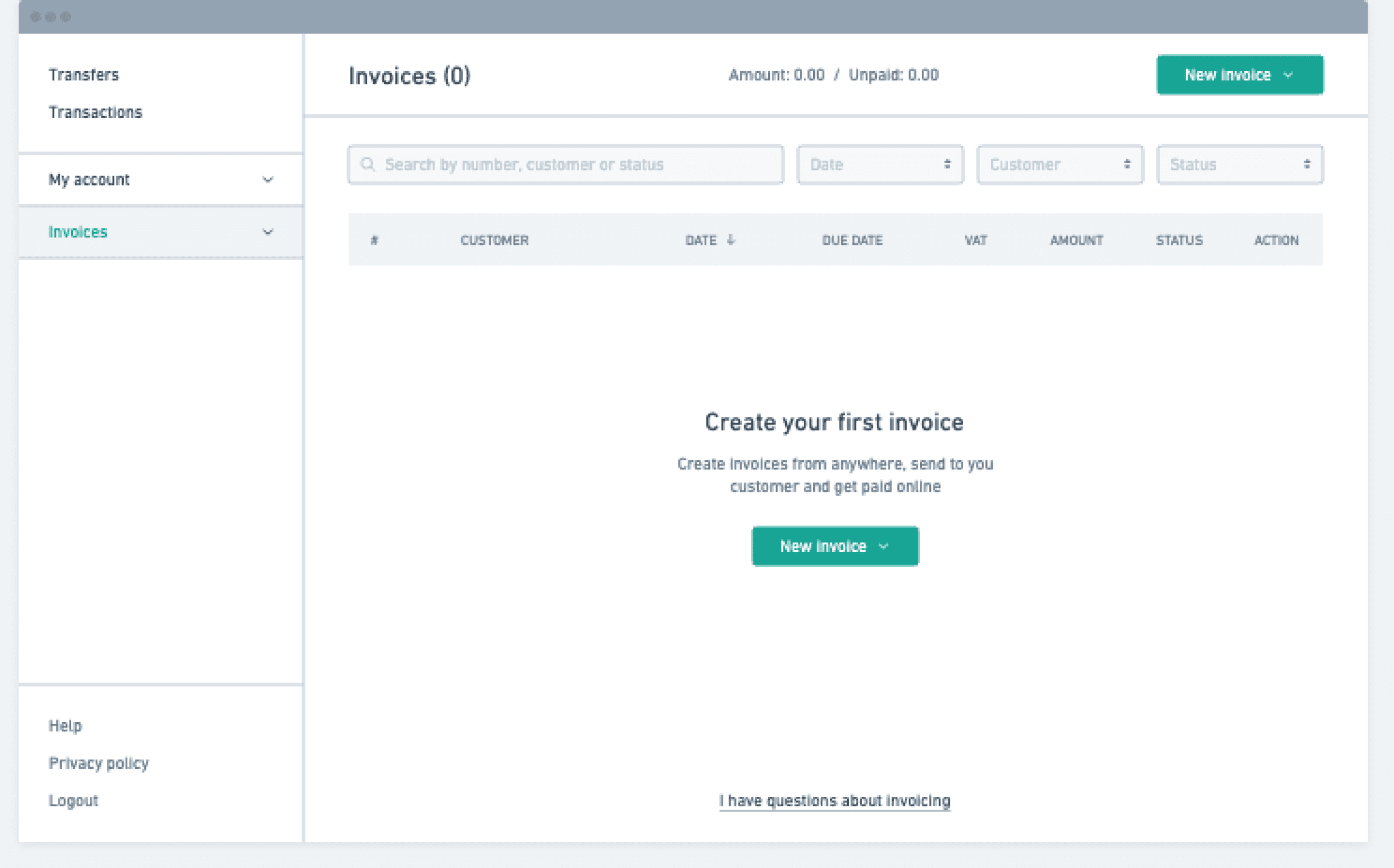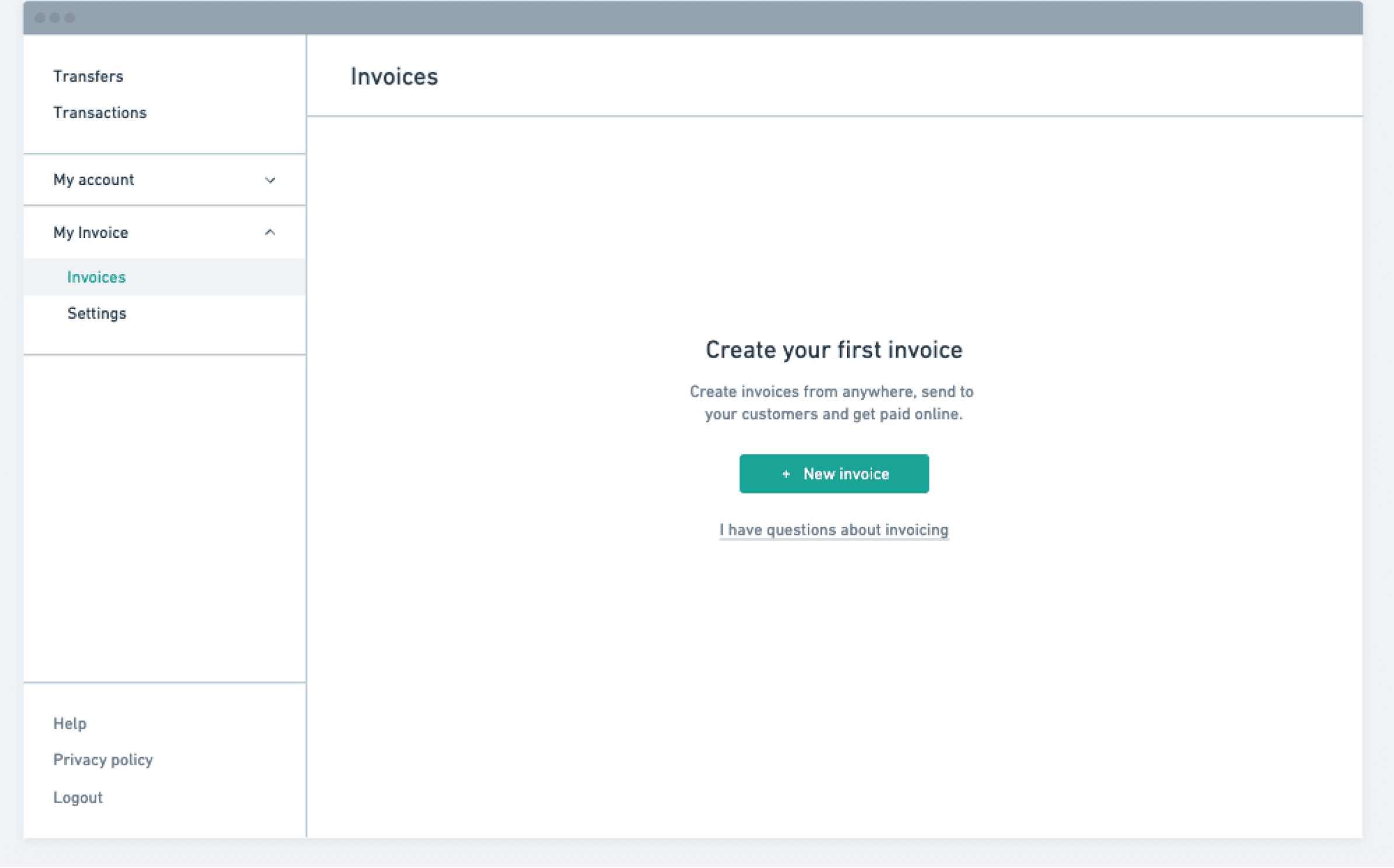 For a new user, a ‘Add Invoice’ button is displayed in the center of the screen with a link to additional information about invoicing.