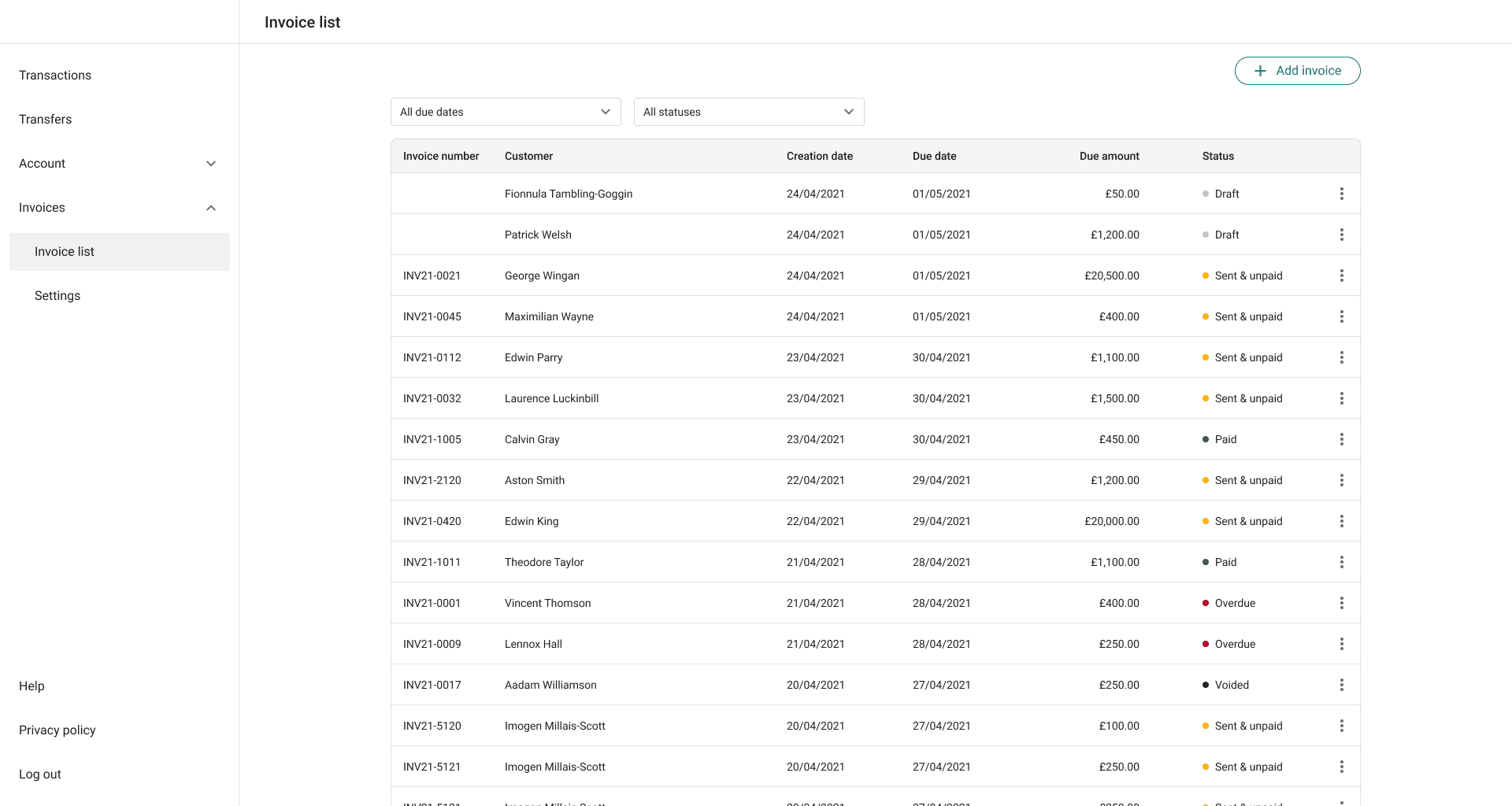 After approving the wireframes, Grigore proceeded to refine the details and design the hi-fi mocks in Figma. The main page for the Invoices section is the invoice list. On this page, the user can view all invoices and create a new one.
